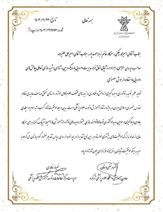 امیرمحمد چکنی دانشجوی کارشناسی پرستاری و زهرا موحدپور دانشجوی کارشناسی مامایی با ارائه خلاقانه و نوآورانه، موفق به کسب مقام های دوم و سوم حیطه یاددهی و یادگیری با رویکرد هوش مصنوعی با عناوین "طراحی، اجرا و ارزشیابی پلتفرم آموزشی مهارتهای ارتباطی با بیمار در محیطهای درمانی با استفاده از واقعیت مجازی و هوش مصنوعی" و "طراحی اجرا و ارزشیابی اتاق فرار مدیریت دارویی با رویکرد بین رشتهای؛ شبیهسازی تعاملی چالشهای دارویی با استفاده از هوش مصنوعی" شدند.