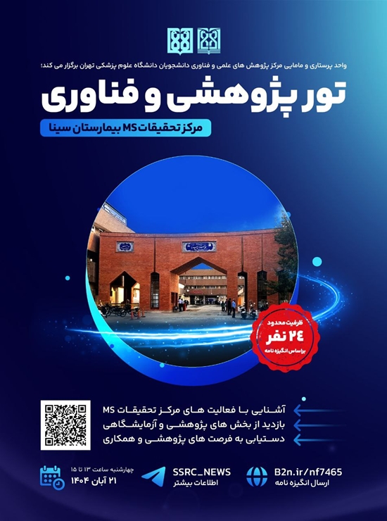 معاونت پژوهشی، مرکز پژوهش های علمی و فناوری واحد پرستاری و مامایی دانشگاه علوم پزشکی تهران تور پژوهشی بازدید از مرکز تحقیقات MS بیمارستان سینا را برگزار می‌کند: